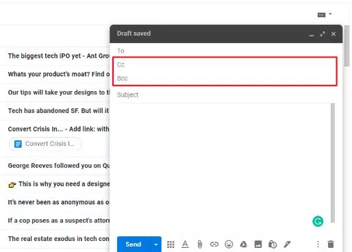 A CC email can be sent with ease, and the majority of people are already familiar with how to use one. Typically, the "CC" field appears in your email composing window just above the "BCC" field or below the "To" box. Simply enter your principal contact's information in the "To" area, followed by the contacts you want to discuss the thread within the "CC" field. While utilizing both CC and BCC simultaneously, you must always double-check that the relevant contacts are listed in the right fields because sharing private email addresses with others can be troublesome.